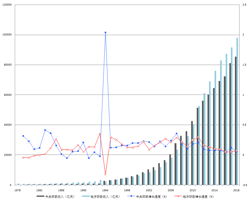 1978年—2018年中央和地方財政收入及增長速度[1]