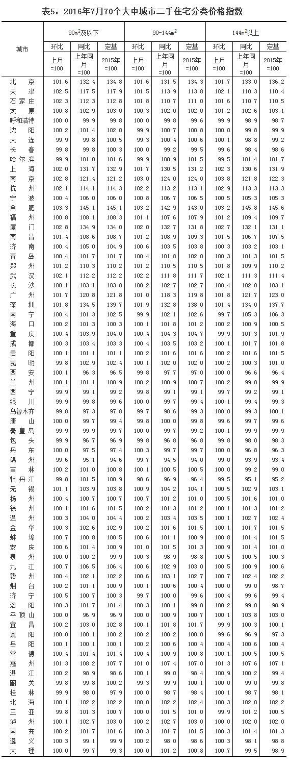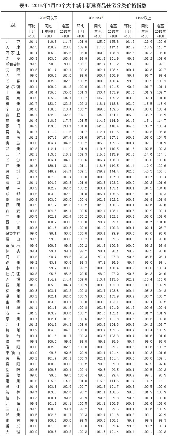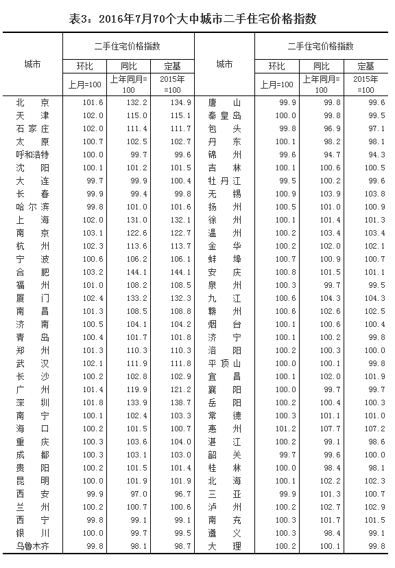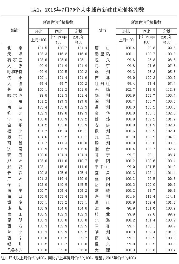 2016年7月份70個(gè)大中城市住宅銷售價(jià)格變動情況