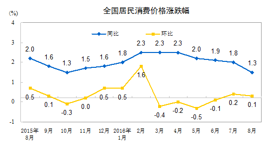 2016年8月份居民消費(fèi)價(jià)格同比上漲1.3%