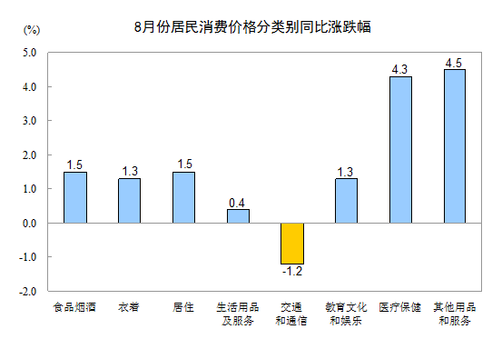 8月份,其他七大類價(jià)格同比六漲一降。其中,其他用品和服務(wù)、醫(yī)療保健、居住、衣著、教育文化和娛樂、生活用品及服務(wù)價(jià)格分別上漲4.5%、4.3%、1.5%、1.3%、1.3%、0.4%;交通和通信價(jià)格下降1.2%。