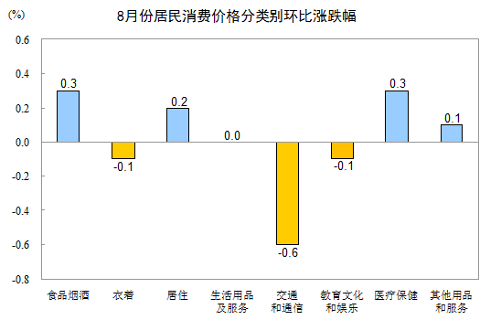 8月份,其他七大類價(jià)格環(huán)比三漲三降一平。其中,醫(yī)療保健、居住、其他用品和服務(wù)價(jià)格分別上漲0.3%、0.2%、0.1%;交通和通信、衣著、教育文化和娛樂價(jià)格分別下降0.6%、0.1%、0.1%;生活用品及服務(wù)價(jià)格持平。