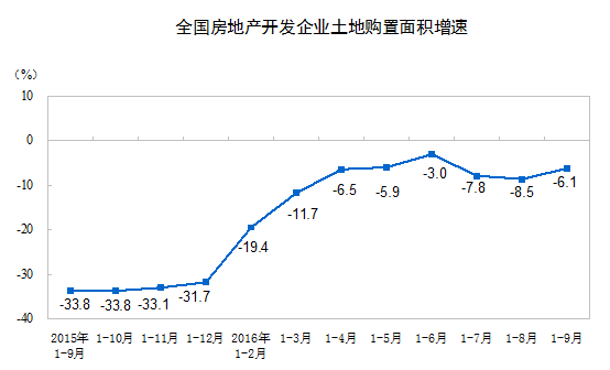 1-9月份,房地產(chǎn)開發(fā)企業(yè)土地購置面積14917萬平方米,同比下降6.1%,降幅比1-8月份收窄2.4個百分點;土地成交價款5569億元,增長13.3%,增速提高5.4個百分點。