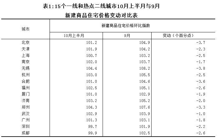 注1:為快速反映近期房地產(chǎn)市場的變化,國家統(tǒng)計(jì)局在做好9月份70個大中城市房價(jià)統(tǒng)計(jì)的同時,對其中一線和部分熱點(diǎn)二線城市10月上半月的房地產(chǎn)市場情況進(jìn)行了統(tǒng)計(jì)。
