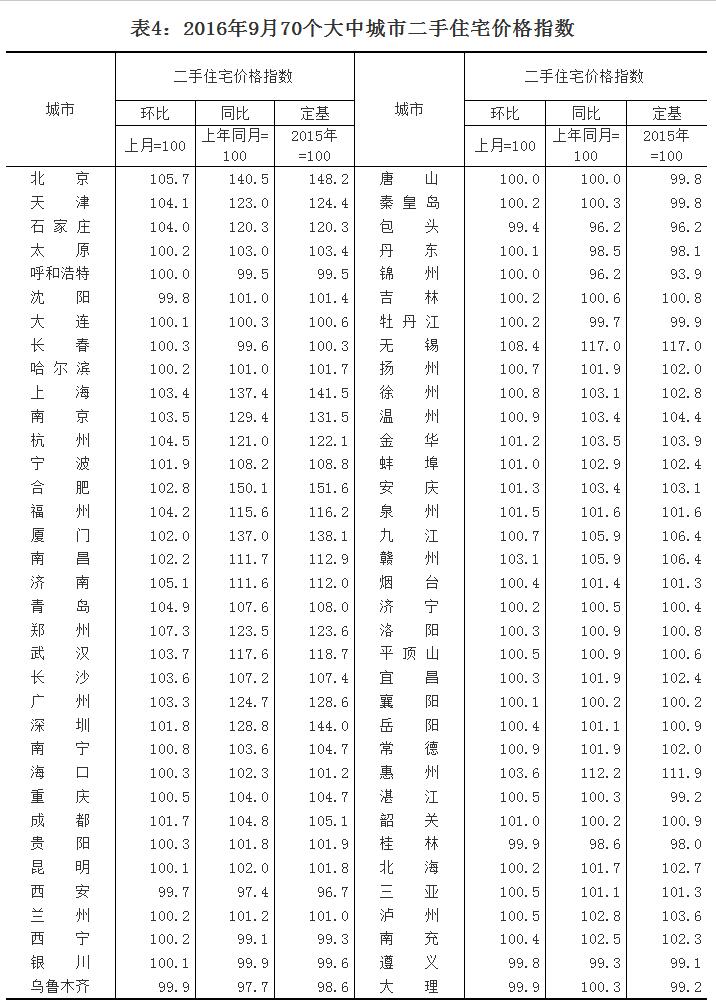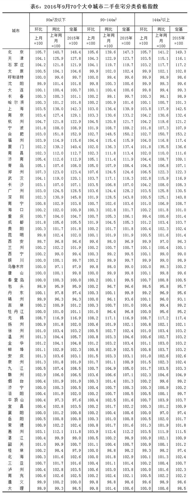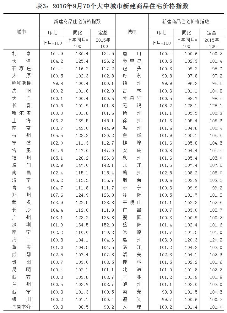 2016年9月份70個大中城市及10月上半月一線和熱點(diǎn)二線城市