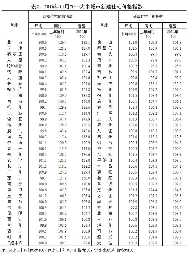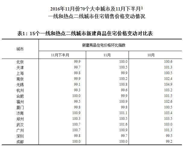 注:1、為深入反映房地產(chǎn)市場近期變化,國家統(tǒng)計局在做好11月份70個大中城市房價統(tǒng)計的同時,又對其中15個一線和熱點二線城市11月下半月房價與11月上半月比較的變動情況進行了統(tǒng)計