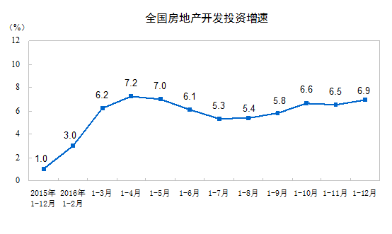 2016年,全國房地產(chǎn)開發(fā)投資102581億元,比上年名義增長6.9%(扣除價(jià)格因素實(shí)際增長7.5%),增速比1-11月份提高0.4個(gè)百分點(diǎn)。其中,住宅投資68704億元,增長6.4%,增速提高0.4個(gè)百分點(diǎn)。住宅投資占房地產(chǎn)開發(fā)投資的比重為67.0%。