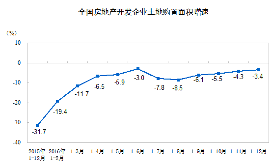 2016年,房地產(chǎn)開發(fā)企業(yè)土地購置面積22025萬平方米,比上年下降3.4%,降幅比1-11月份收窄0.9個(gè)百分點(diǎn);土地成交價(jià)款9129億元,增長19.8%,增速回落1.6個(gè)百分點(diǎn)。