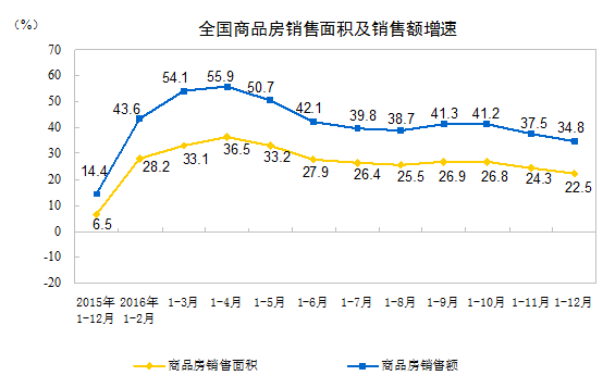 2016年,商品房銷售面積157349萬平方米,比上年增長22.5%,增速比1-11月份回落1.8個(gè)百分點(diǎn)。其中,住宅銷售面積增長22.4%,辦公樓銷售面積增長31.4%,商業(yè)營業(yè)用房銷售面積增長16.8%。商品房銷售額117627億元,增長34.8%,增速回落2.7個(gè)百分點(diǎn)。其中,住宅銷售額增長36.1%,辦公樓銷售額增長45.8%,商業(yè)營業(yè)用房銷售額增長19.5%。