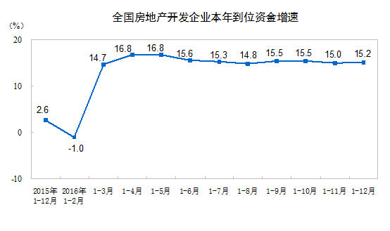 2016年,房地產(chǎn)開發(fā)企業(yè)到位資金144214億元,比上年增長15.2%,增速比1-11月份提高0.2個(gè)百分點(diǎn)。其中,國內(nèi)貸款21512億元,增長6.4%;利用外資140億元,下降52.6%;自籌資金49133億元,增長0.2%;其他資金73428億元,增長31.9%。在其他資金中,定金及預(yù)收款41952億元,增長29.0%;個(gè)人按揭貸款24403億元,增長46.5%。