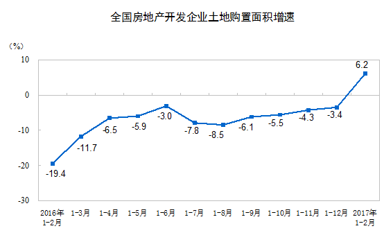 1-2月份,房地產(chǎn)開(kāi)發(fā)企業(yè)土地購(gòu)置面積2374萬(wàn)平方米,同比增長(zhǎng)6.2%,去年全年為下降3.4%;土地成交價(jià)款794億元,增長(zhǎng)12.7%,增速回落7.1個(gè)百分點(diǎn)。