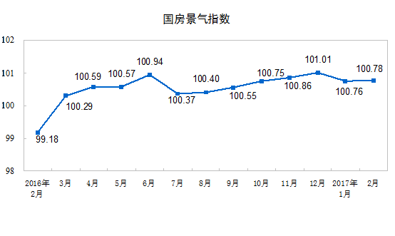 2月份,房地產(chǎn)開(kāi)發(fā)景氣指數(shù)(簡(jiǎn)稱(chēng)“國(guó)房景氣指數(shù)”,今年起發(fā)布的是基期修定后的值)為100.78,比1月份提高0.02點(diǎn)。