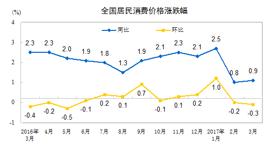 2017年3月份居民消費(fèi)價格同比上漲0.9%
