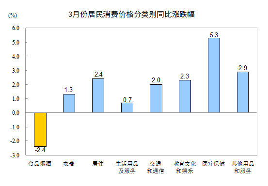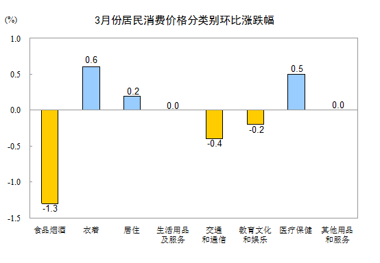 3月份,全國居民消費(fèi)價格總水平環(huán)比下降0.3%。其中,城市下降0.3%,農(nóng)村下降0.4%;食品價格下降1.9%,非食品價格上漲0.1%;消費(fèi)品價格下降0.5%,服務(wù)價格上漲0.1%。