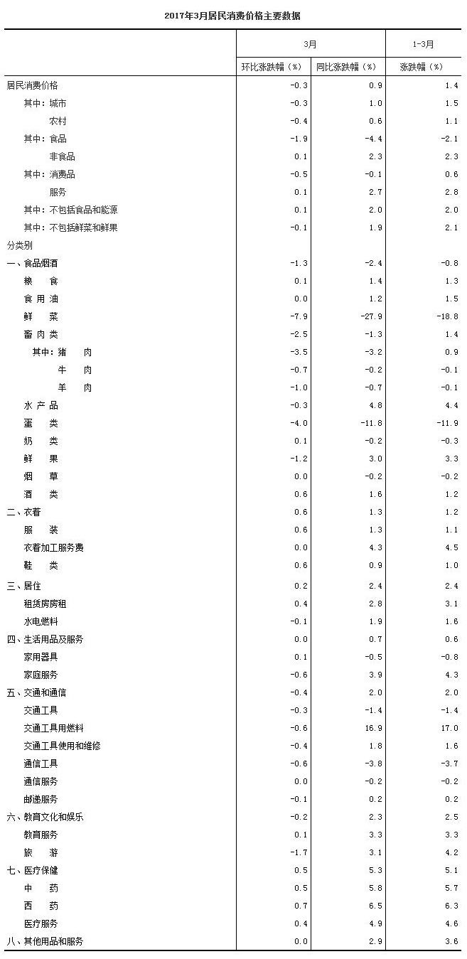 2017年3月份,全國居民消費(fèi)價格總水平同比上漲0.9%。其中,城市上漲1.0%,農(nóng)村上漲0.6%;食品價格下降4.4%,非食品價格上漲2.3%;消費(fèi)品價格下降0.1%,服務(wù)價格上漲2.7%。一季度,全國居民消費(fèi)價格總水平比去年同期上漲1.4%。
