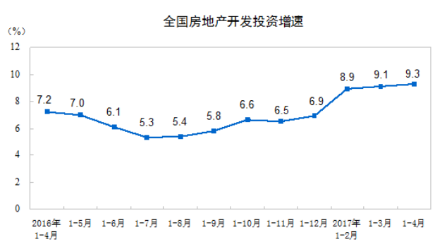 2017年1-4月份,全國房地產(chǎn)開發(fā)投資27732億元,同比名義增長9.3%,增速比1-3月份提高0.2個百分點。其中,住宅投資18671億元,增長10.6%,增速回落0.6個百分點。住宅投資占房地產(chǎn)開發(fā)投資的比重為67.3%。