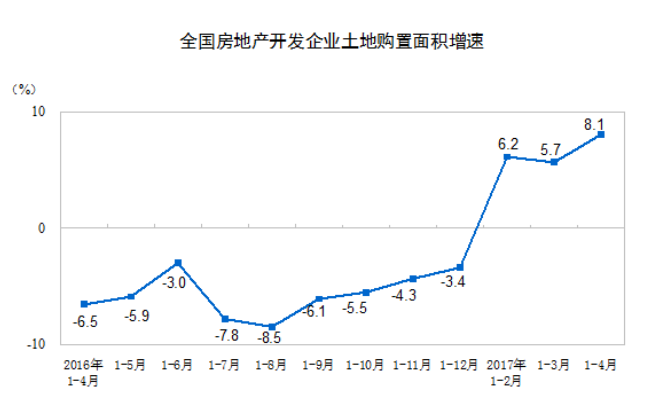 1-4月份,房地產(chǎn)開發(fā)企業(yè)土地購置面積5528萬平方米,同比增長8.1%,增速比1-3月份提高2.4個百分點;土地成交價款2104億元,增長34.2%,增速提高17.5個百分點。