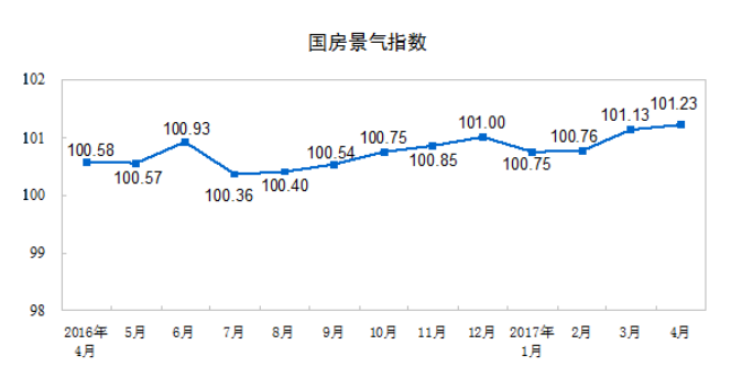 4月份,房地產(chǎn)開發(fā)景氣指數(shù)(簡稱“國房景氣指數(shù)”)為101.23,比3月份提高0.10點。