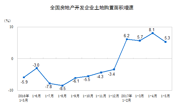 1-5月份,房地產(chǎn)開發(fā)企業(yè)土地購(gòu)置面積7580萬平方米,同比增長(zhǎng)5.3%,增速比1-4月份回落2.8個(gè)百分點(diǎn);土地成交價(jià)款3036億元,增長(zhǎng)32.3%,增速回落1.9個(gè)百分點(diǎn)。