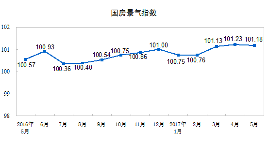 5月份,房地產(chǎn)開發(fā)景氣指數(shù)(簡(jiǎn)稱“國(guó)房景氣指數(shù)”)為101.18,比4月份提高0.05點(diǎn)。