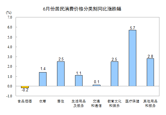 6月份,其他七大類價格同比均有所上漲。其中,醫(yī)療保健價格上漲5.7%,其他用品和服務價格上漲2.8%,居住、教育文化和娛樂價格均上漲2.5%,衣著、生活用品及服務、交通和通信價格分別上漲1.4%、1.1%和0.1%。
