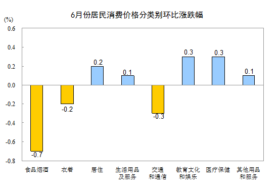 6月份,全國居民消費價格環(huán)比下降0.2%。其中,城市下降0.1%,農(nóng)村下降0.2%;食品價格下降1.0%,非食品價格上漲0.1%;消費品價格下降0.4%,服務價格上漲0.3%。