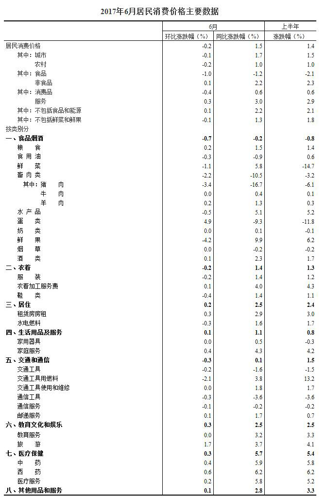 2017年6月份,全國居民消費價格同比上漲1.5%。其中,城市上漲1.7%,農(nóng)村上漲1.0%;食品價格下降1.2%,非食品價格上漲2.2%;消費品價格上漲0.6%,服務價格上漲3.0%。上半年,全國居民消費價格總水平比去年同期上漲1.4%。