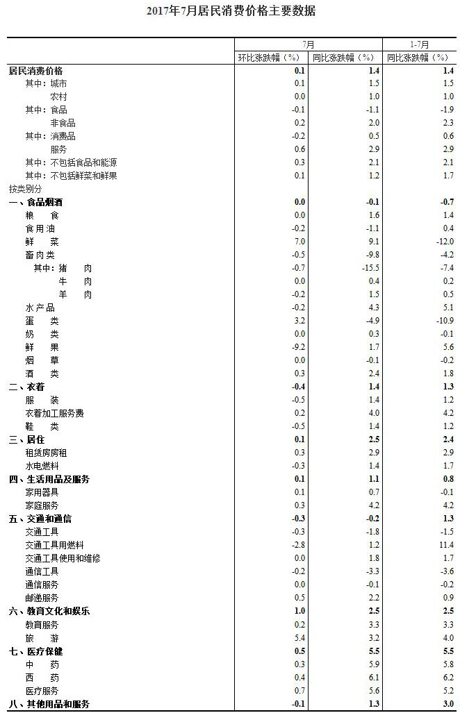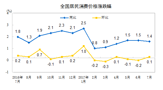 2017年7月份居民消費(fèi)價(jià)格同比上漲1.4%