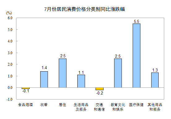 7月份,其他七大類價(jià)格同比六漲一降。其中,醫(yī)療保健價(jià)格上漲5.5%,居住、教育文化和娛樂價(jià)格均上漲2.5%,衣著、其他用品和服務(wù)、生活用品及服務(wù)價(jià)格分別上漲1.4%、1.3%和1.1%;交通和通信價(jià)格下降0.2%。