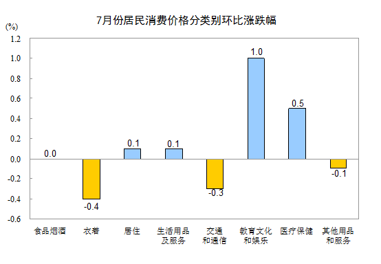 7月份,其他七大類價(jià)格環(huán)比四漲三降。其中,教育文化和娛樂、醫(yī)療保健價(jià)格分別上漲1.0%和0.5%,居住、生活用品及服務(wù)價(jià)格均上漲0.1%;衣著、交通和通信、其他用品和服務(wù)價(jià)格分別下降0.4%、0.3%和0.1%。