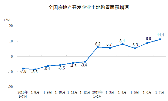 1-7月份,房地產(chǎn)開(kāi)發(fā)企業(yè)土地購(gòu)置面積12410萬(wàn)平方米,同比增長(zhǎng)11.1%,增速比1-6月份提高2.3個(gè)百分點(diǎn);土地成交價(jià)款5428億元,增長(zhǎng)41.0%,增速提高2.5個(gè)百分點(diǎn)。