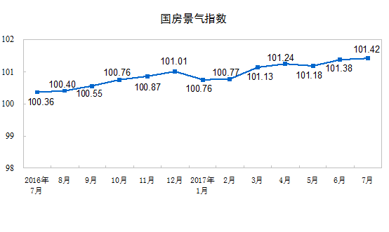 7月份,房地產(chǎn)開(kāi)發(fā)景氣指數(shù)(簡(jiǎn)稱(chēng)“國(guó)房景氣指數(shù)”)為101.42,比6月份提高0.04點(diǎn)。