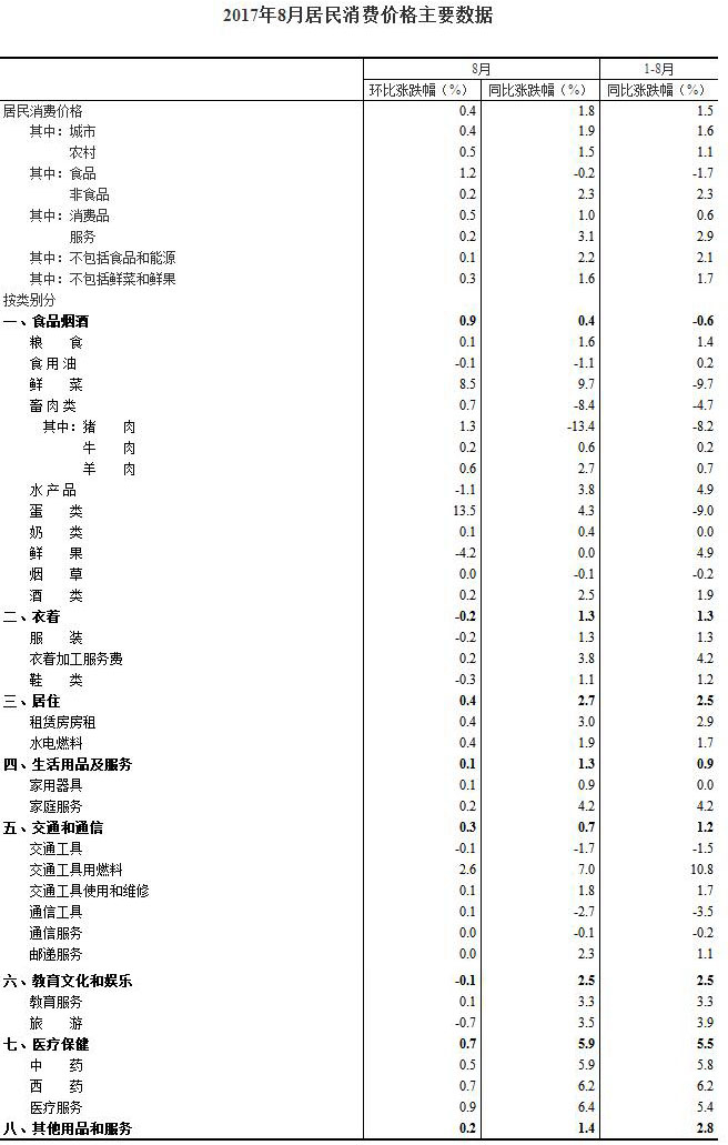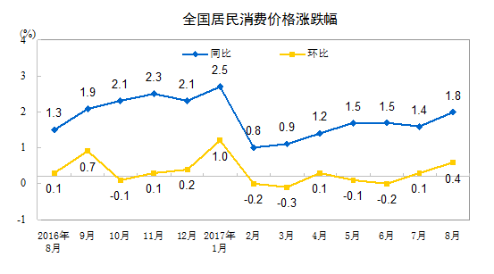 2017年8月份居民消費(fèi)價(jià)格同比上漲1.8%