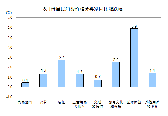 8月份,其他七大類價(jià)格同比均有所上漲。其中,醫(yī)療保健、居住、教育文化和娛樂價(jià)格分別上漲5.9%、2.7%和2.5%,其他用品和服務(wù)價(jià)格上漲1.4%,衣著、生活用品及服務(wù)價(jià)格均上漲1.3%,交通和通信價(jià)格上漲0.7%。