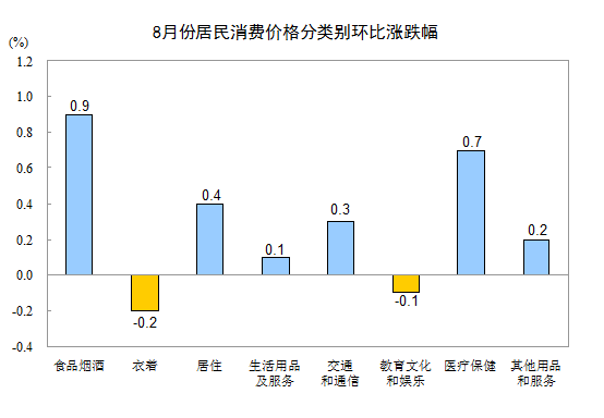 8月份,全國(guó)居民消費(fèi)價(jià)格環(huán)比上漲0.4%。其中,城市上漲0.4%,農(nóng)村上漲0.5%;食品價(jià)格上漲1.2%,非食品價(jià)格上漲0.2%;消費(fèi)品價(jià)格上漲0.5%,服務(wù)價(jià)格上漲0.2%。