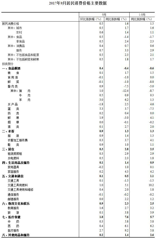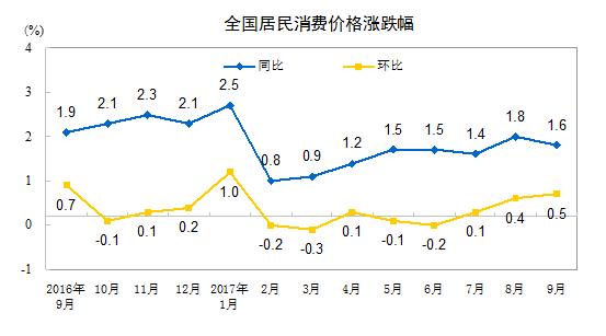 2017年9月份居民消費(fèi)價(jià)格同比上漲1.6%