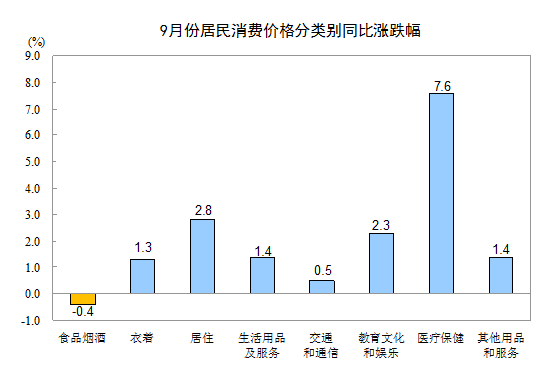 9月份,其他七大類價(jià)格同比均有不同程度的上漲。其中,醫(yī)療保健、居住、教育文化和娛樂價(jià)格分別上漲7.6%、2.8%和2.3%,生活用品及服務(wù)、其他用品和服務(wù)價(jià)格均上漲1.4%,衣著、交通和通信價(jià)格分別上漲1.3%和0.5%。