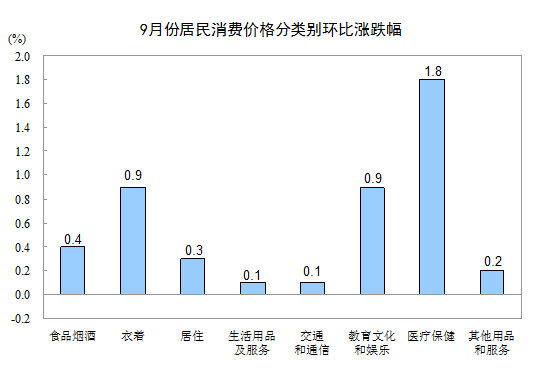 9月份,其他七大類價(jià)格環(huán)比均有不同程度的上漲。其中,醫(yī)療保健、居住、交通和通信價(jià)格分別上漲1.8%、0.3%和0.1%,其他用品和服務(wù)、生活用品及服務(wù)價(jià)格分別上漲0.2%和0.1%;衣著、教育文化和娛樂價(jià)格均上漲0.9%。