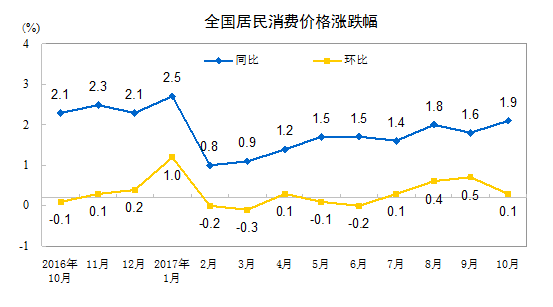 2017年10月份,全國居民消費價格同比上漲1.9%。其中,城市上漲1.9%,農(nóng)村上漲1.7%;食品價格下降0.4%,非食品價格上漲2.4%;消費品價格上漲1.1%,服務(wù)價格上漲3.2%。1-10月平均,全國居民消費價格總水平比去年同期上漲1.5%。