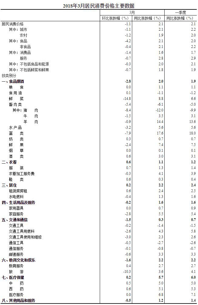 2018年3月份,全國居民消費價格同比上漲2.1%。其中,城市上漲2.1%,農(nóng)村上漲1.9%;食品價格上漲2.1%,非食品價格上漲2.1%;消費品價格上漲1.6%,服務(wù)價格上漲2.8%。一季度,全國居民消費價格總水平比去年同期上漲2.1%。