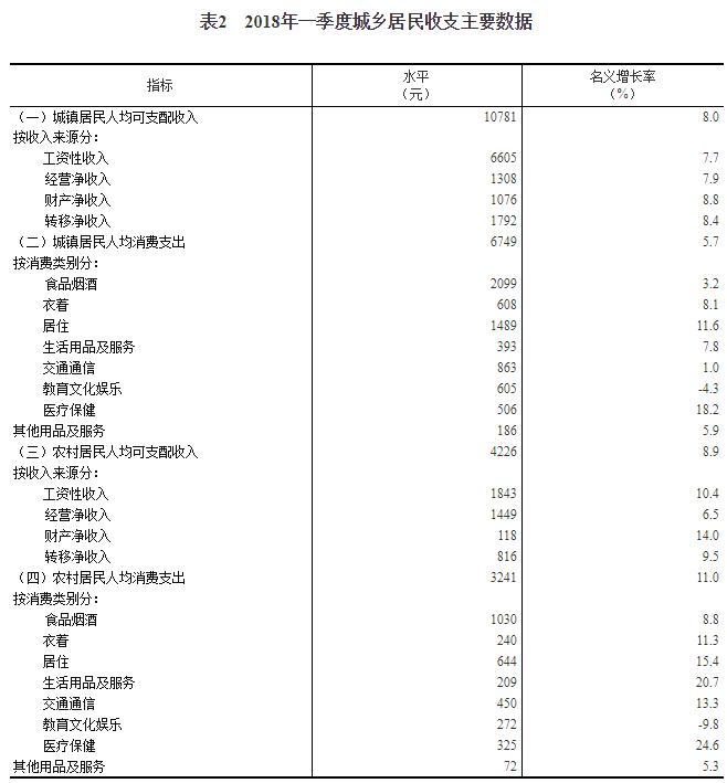 2018年一季度,全國居民人均可支配收入7815元,比上年同期名義增長8.8%,扣除價(jià)格因素,實(shí)際增長6.6%。其中,城鎮(zhèn)居民人均可支配收入10781元,增長(以下如無特別說明,均為同比名義增長)8.0%,扣除價(jià)格因素,實(shí)際增長5.7%;農(nóng)村居民人均可支配收入4226元,增長8.9%,扣除價(jià)格因素,實(shí)際增長6.8%。