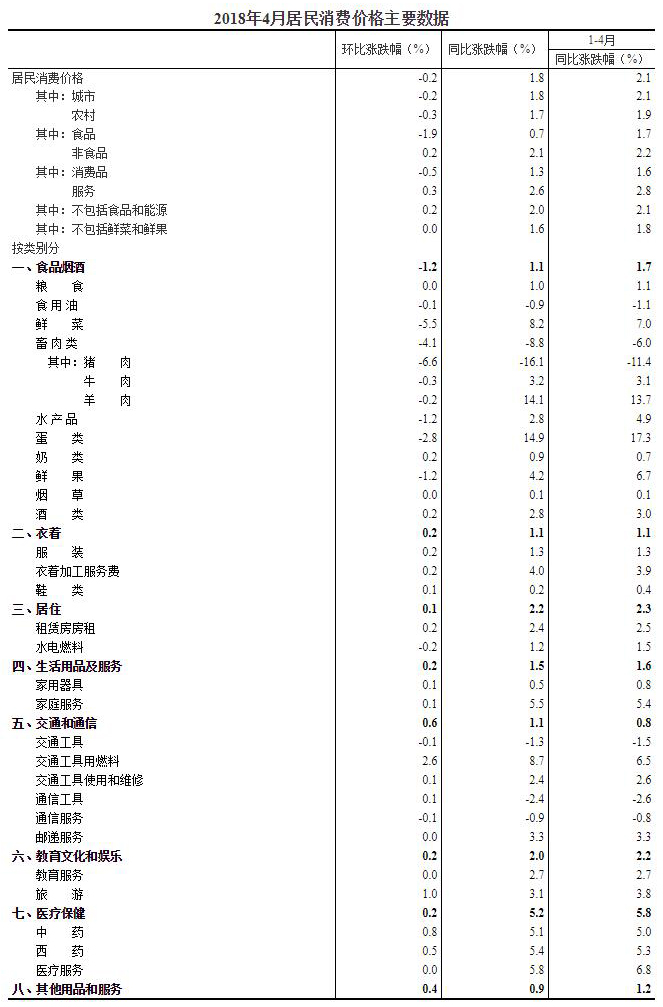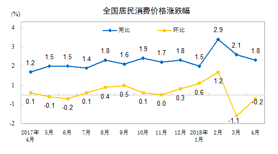 2018年4月份,全國居民消費價格同比上漲1.8%。其中,城市上漲1.8%,農(nóng)村上漲1.7%;食品價格上漲0.7%,非食品價格上漲2.1%;消費品價格上漲1.3%,服務(wù)價格上漲2.6%。1-4月平均,全國居民消費價格總水平比去年同期上漲2.1%。