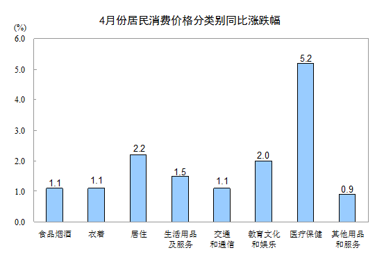 其他七大類價格同比均上漲。其中,醫(yī)療保健、居住、教育文化和娛樂價格分別上漲5.2%、2.2%和2.0%,生活用品及服務(wù)、衣著價格分別上漲1.5%和1.1%,交通和通信、其他用品和服務(wù)價格分別上漲1.1%和0.9%。
