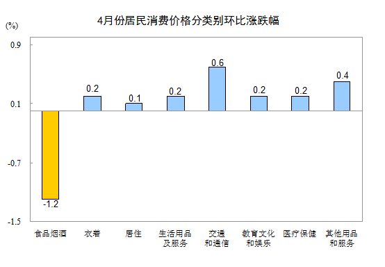4月份,全國居民消費價格環(huán)比下降0.2%。其中,城市下降0.2%,農(nóng)村下降0.3%;食品價格下降1.9%,非食品價格上漲0.2%;消費品價格下降0.5%,服務(wù)價格上漲0.3%。