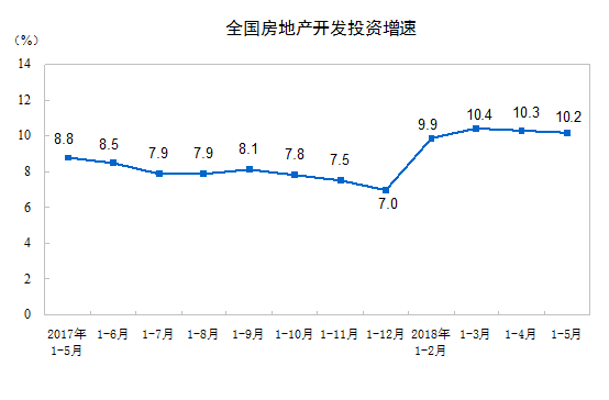 2018年1-5月份,全國房地產(chǎn)開發(fā)投資41420億元,同比名義增長10.2%,增速比1-4月份回落0.1個(gè)百分點(diǎn)。其中,住宅投資29037億元,增長14.2%,增速與1-4月份持平。住宅投資占房地產(chǎn)開發(fā)投資的比重為70.1%。