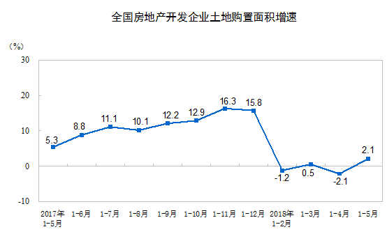 1-5月份,房地產(chǎn)開發(fā)企業(yè)土地購置面積7742萬平方米,同比增長2.1%,1-4月份為下降2.1%;土地成交價(jià)款3522億元,增長16.0%,增速提高2.4個(gè)百分點(diǎn)。