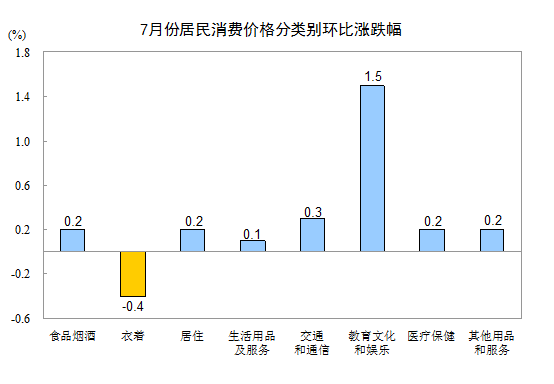7月份,全國居民消費價格環(huán)比上漲0.3%。其中,城市上漲0.4%,農(nóng)村上漲0.1%;食品價格上漲0.1%,非食品價格上漲0.3%;消費品價格上漲0.1%,服務價格上漲0.7%。