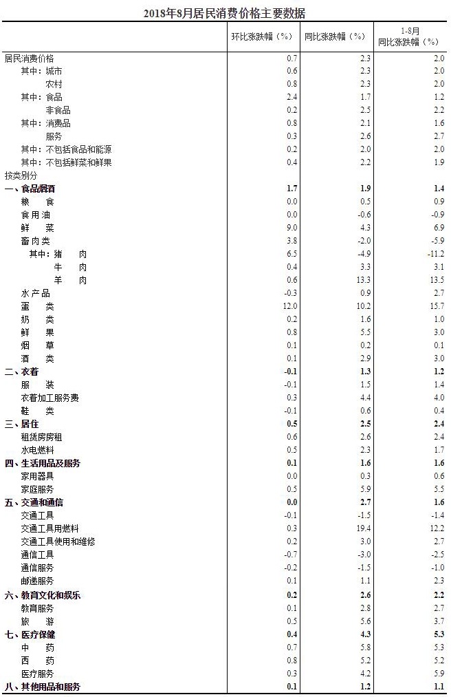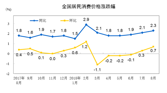 2018年8月份,全國居民消費價格同比上漲2.3%。其中,城市上漲2.3%,農(nóng)村上漲2.3%;食品價格上漲1.7%,非食品價格上漲2.5%;消費品價格上漲2.1%,服務(wù)價格上漲2.6%。1-8月平均,全國居民消費價格比去年同期上漲2.0%。