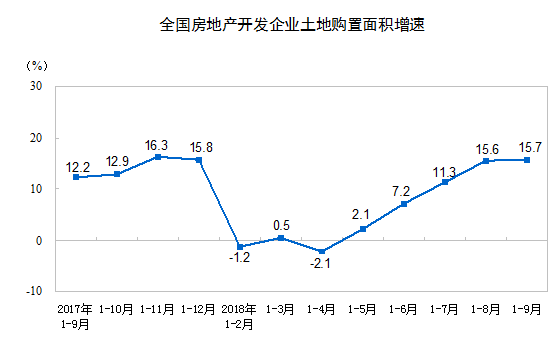 1-9月份,房地產(chǎn)開發(fā)企業(yè)土地購置面積19366萬平方米,同比增長15.7%,增速比1-8月份提高0.1個(gè)百分點(diǎn);土地成交價(jià)款10002億元,增長22.7%,增速回落1個(gè)百分點(diǎn)。
