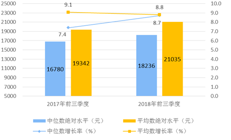 前三季度,全國(guó)居民人均可支配收入中位數(shù)18236元,增長(zhǎng)8.7%,中位數(shù)是平均數(shù)的86.7%。其中,城鎮(zhèn)居民人均可支配收入中位數(shù)27227元,增長(zhǎng)7.4%,是平均數(shù)的92.0%;農(nóng)村居民人均可支配收入中位數(shù)9248元,增長(zhǎng)9.2%,是平均數(shù)的86.9%。