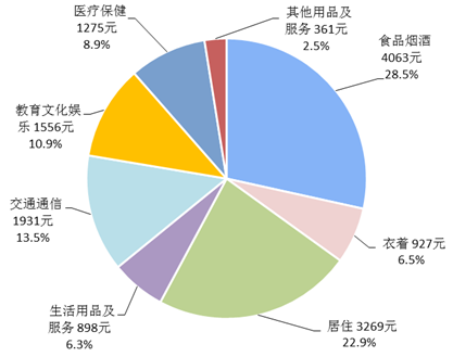 前三季度,全國(guó)居民人均食品煙酒消費(fèi)支出4063元,增長(zhǎng)5.6%,占人均消費(fèi)支出的比重為28.5%;人均衣著消費(fèi)支出927元,增長(zhǎng)4.2%,占人均消費(fèi)支出的比重為6.5%;人均居住消費(fèi)支出3269元,增長(zhǎng)12.2%,占人均消費(fèi)支出的比重為22.9%;人均生活用品及服務(wù)消費(fèi)支出898元,增長(zhǎng)9.4%,占人均消費(fèi)支出的比重為6.3%;人均交通通信消費(fèi)支出1931元,增長(zhǎng)7.6%,占人均消費(fèi)支出的比重為13.5%;人均教育文化娛樂(lè)消費(fèi)支出1556元,增長(zhǎng)5.8%,占人均消費(fèi)支出的比重為10.9%;人均醫(yī)療保健消費(fèi)支出1275元,增長(zhǎng)17.4%,占人均消費(fèi)支出的比重為8.9%;人均其他用品及服務(wù)消費(fèi)支出361元,增長(zhǎng)7.1%,占人均消費(fèi)支出的比重為2.5%。